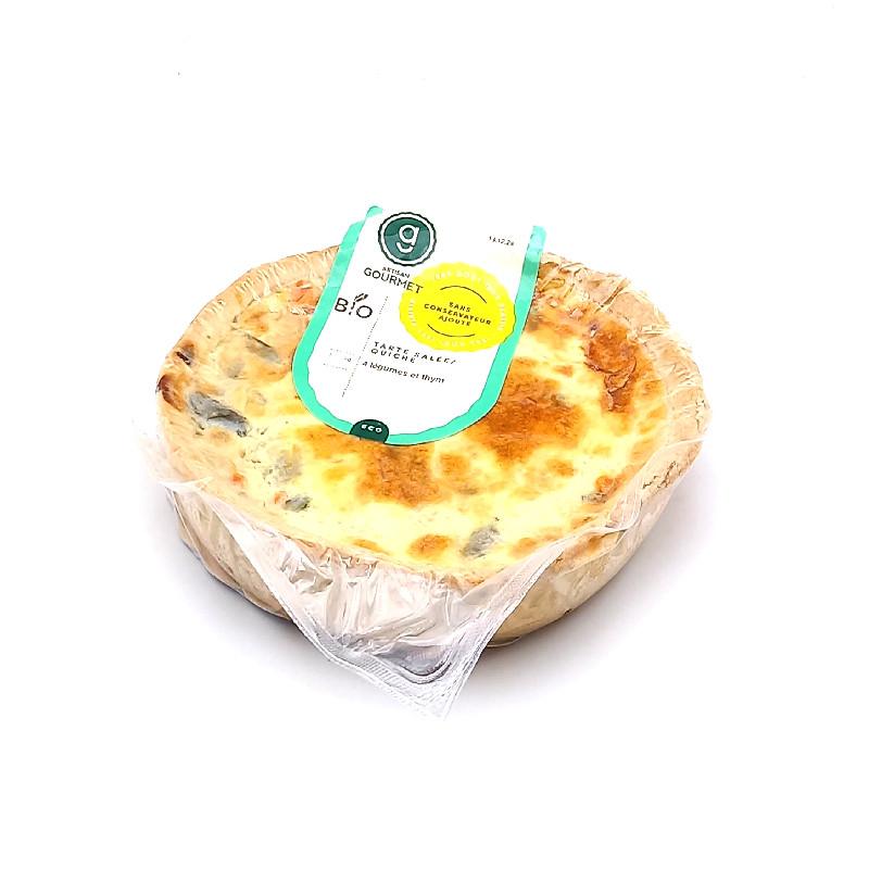 Découvrez notre Quiche Légumes & Thym, un mélange parfait de légumes de saison (poireau, petit pois, tomate et carotte) relevé d'une touche de thym frais pour apporter une note aromatique. La garniture crémeuse à base de crème et d'œufs sur une pâte dorée offre une texture fondante et légère.