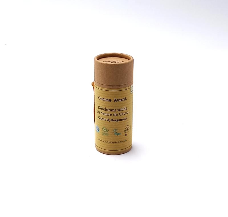 Découvrez le Déodorant Solide au Beurre de Cacao Bio - Citron & Bergarmote - Comme Avant, une alternative efficace pour réguler le niveau de transpiration.