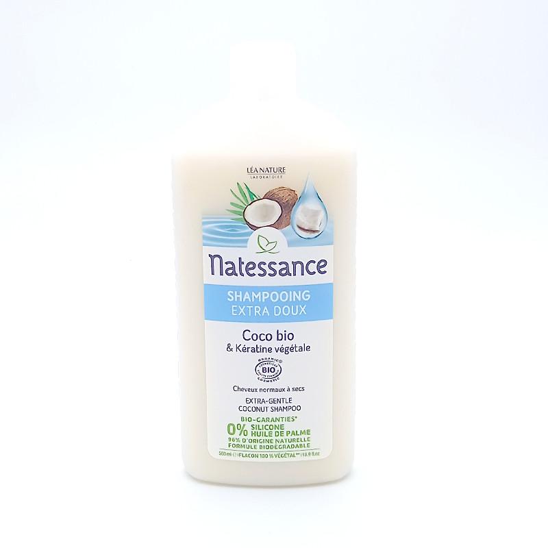 Ce shampooing Extra-doux de Natessance est à l'huile de coco hydratante, est idéal pour nettoyer les cheveux normaux à secs. La kératine végétale brevetée contribue à les protéger et les régénérer.
