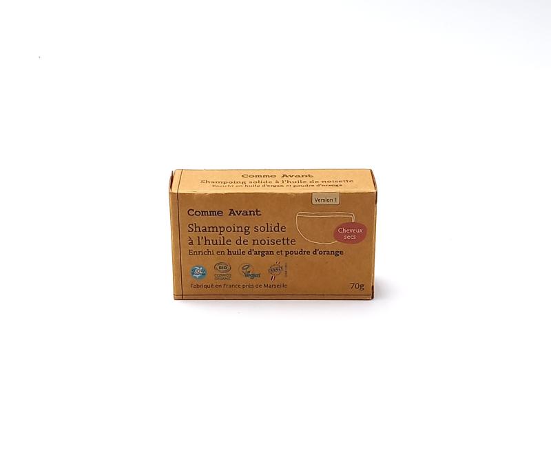 Shampoing solide naturel certifié bio à l'huile de noisette, enrichi en huile d'argan et poudre d'orange, idéal pour les cheveux secs.