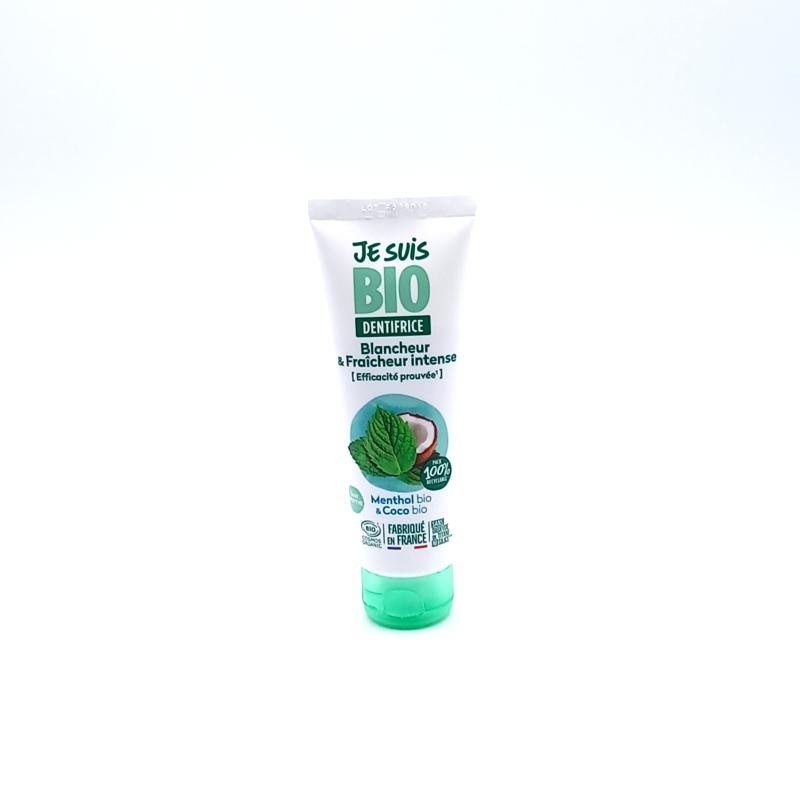 Dentifrice blancheur et fraîcheur, à l'arôme de menthe intense d'origine naturelle. Emballage 100% recyclable. Fabrication : France.